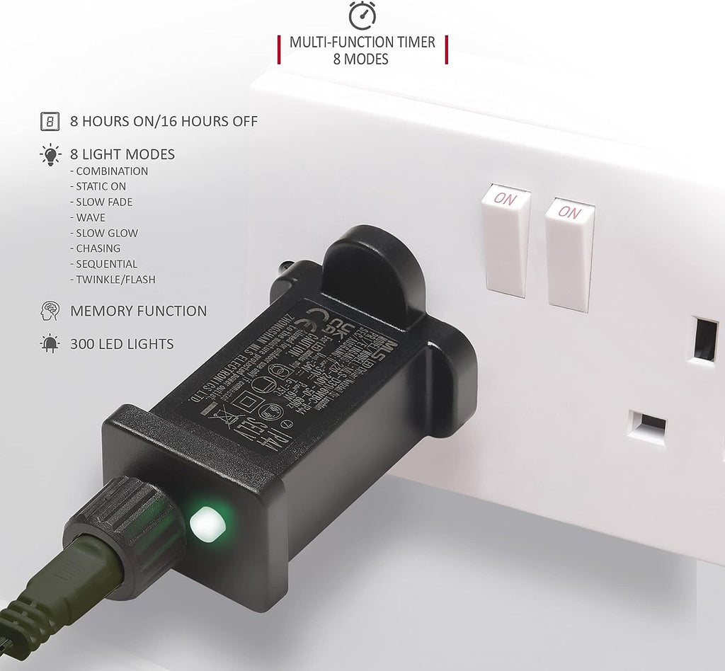 TIMER: 8 hours on 16 hours off; 8 functions: Combination, Steady On, Slow Fade, In Waves, Slow Glow, Chasing/Flash, Sequential and Twinkle/Flash.
