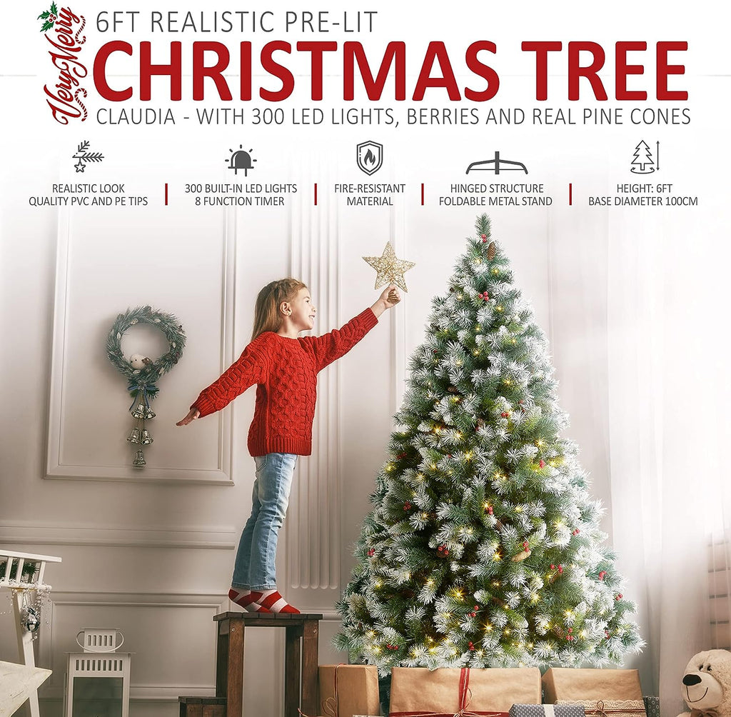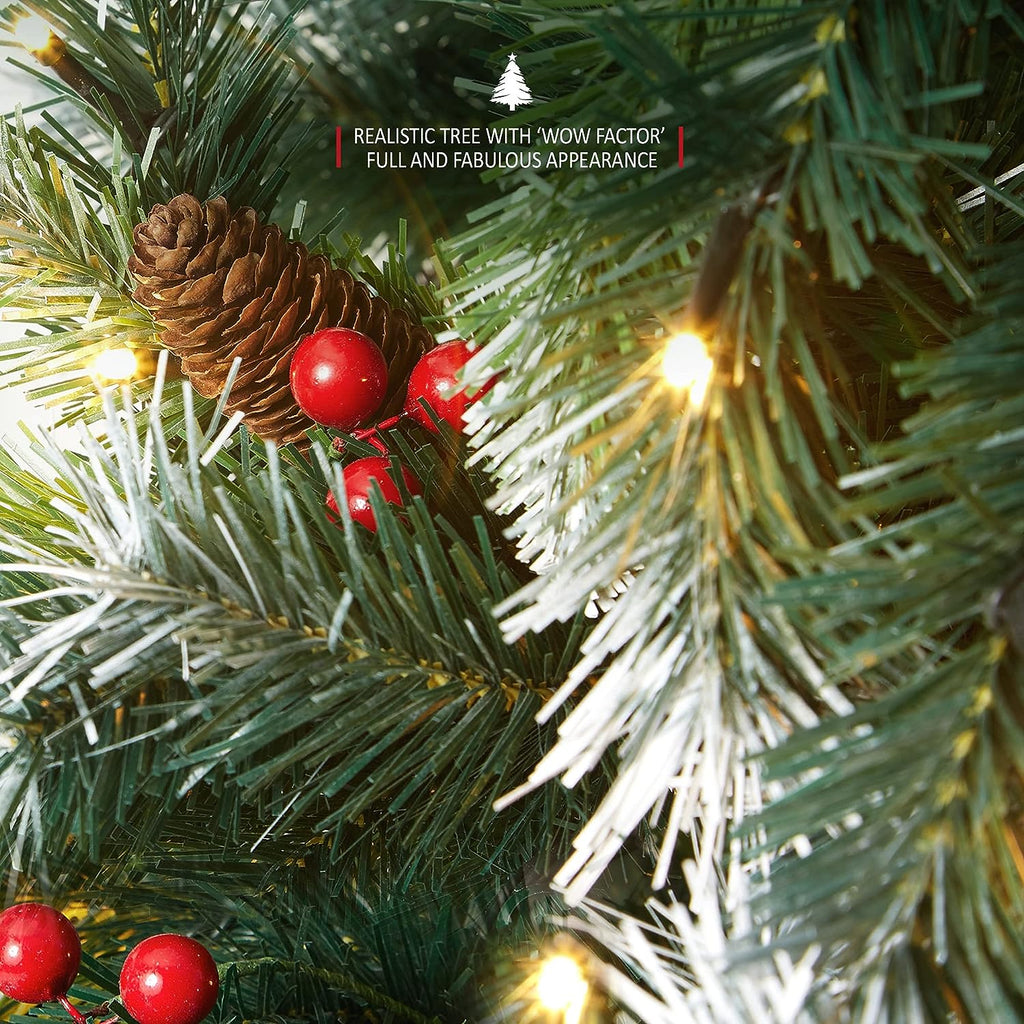 - PRE-LIT LED TREE DÉCOR: This Claudia Pre-Lit Christmas Tree is a must-have for the festive season. Measuring at 5/6/7 feet high with a diameter of 85/100/120cm, this tree will have no problems being the centrepiece of your home over the Christmas period. Fitted with warm white LED lights and a beautiful arrangement of pinecones and berries, this tree is sure to be the centre of attention this Christmas.
