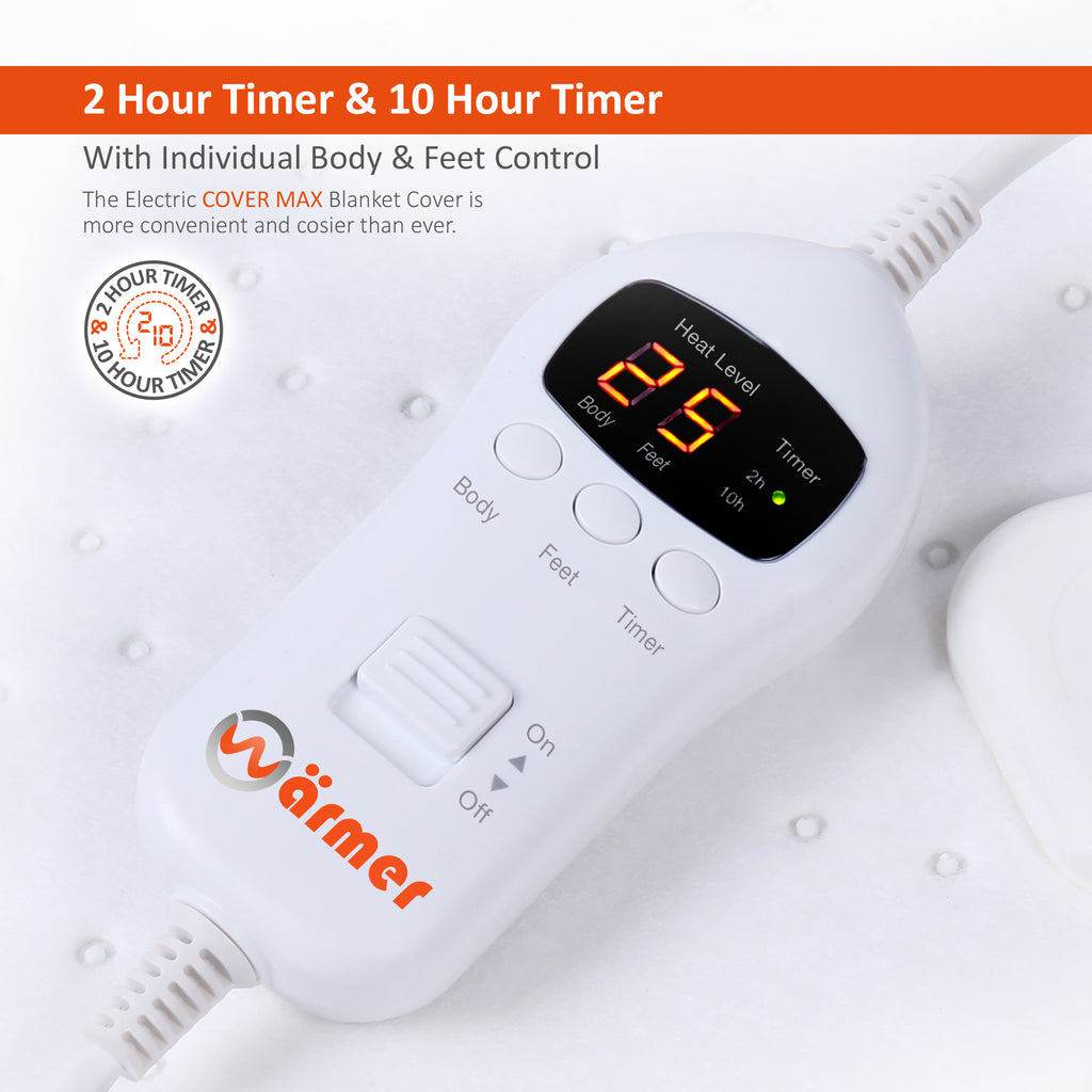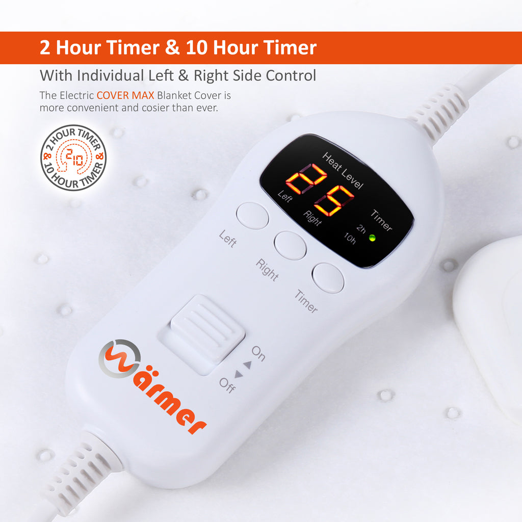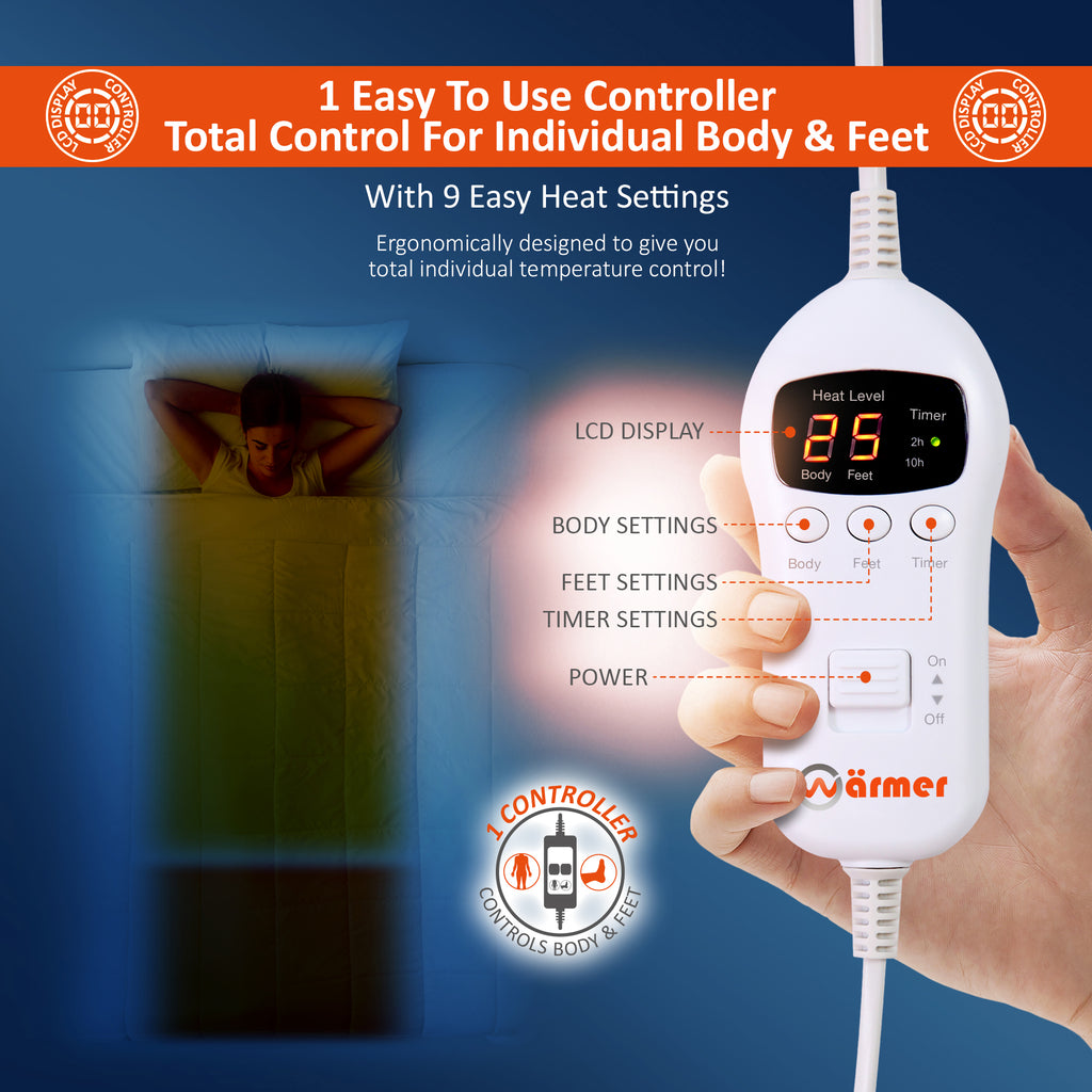 One easy-to-use controller operates both the left and right sides of the blanket (single size offers independent body and feet control instead), giving individual heat control with 9 heat settings and a timer up to 10 hours – maximum comfort with minimal effort.