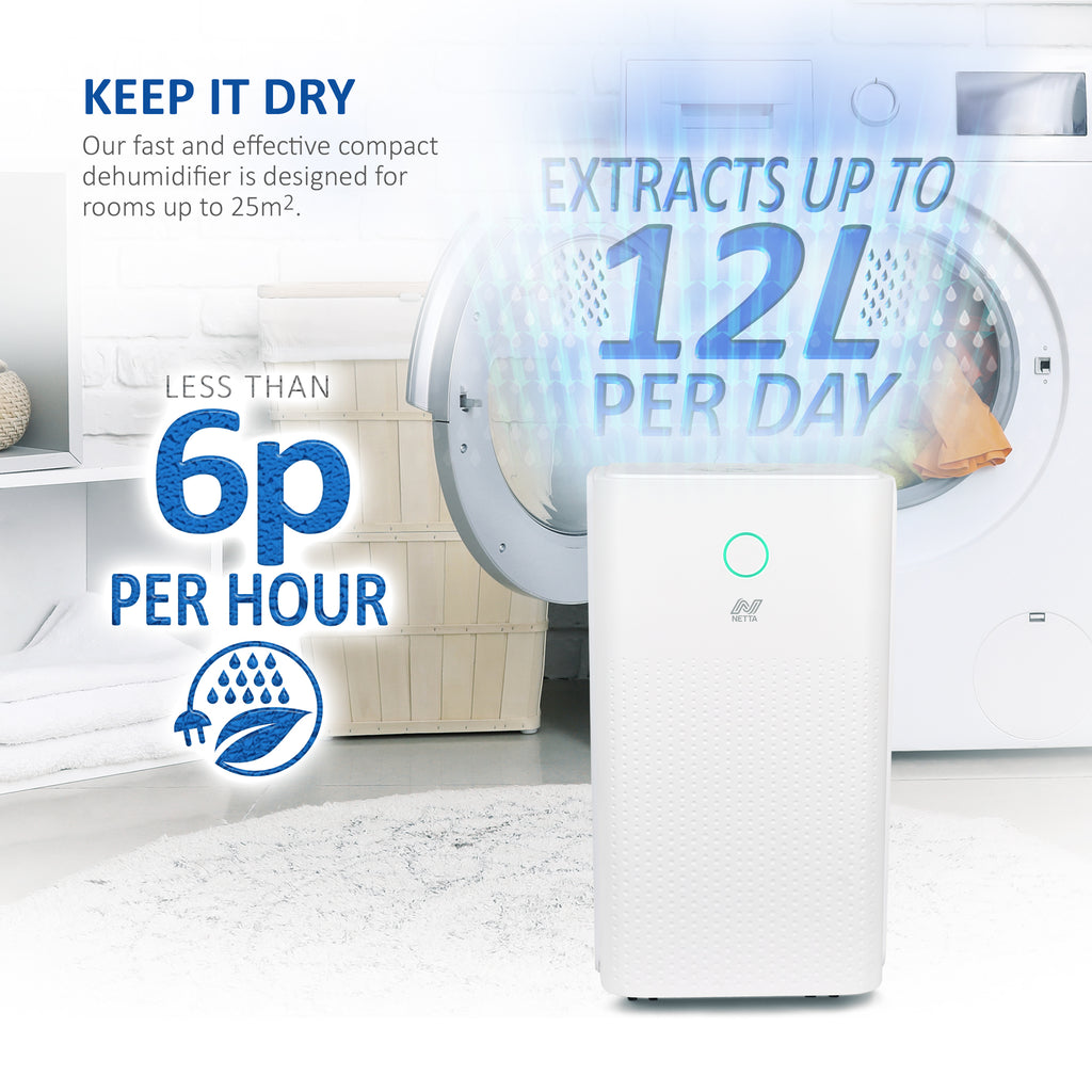 This NETTA 12L Dehumidifier is ideal for removing the causes of humidity, damp and mould in homes, basements and bathrooms. This dehumidifier was designed with a sleek style in mind, ensuring that it looks great in your home. It is perfectly suited for rooms up to 25m² and it also has rolling caster wheels which make it super-easy to move around your home.